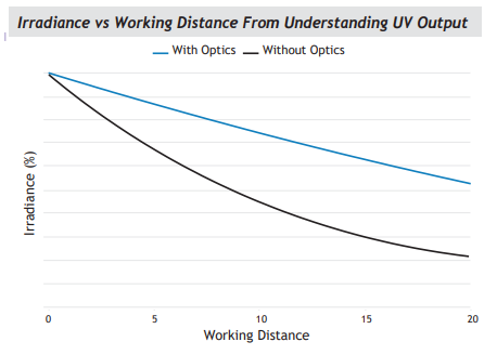 The peak irradiance is affected by the light source output, the use of reflectors or optics to concentrate the rays into a narrower surface impact area, and the distance of the source from the curing surface. The irradiation of UV LEDs on the curing surface decreases rapidly as the distance between the source and the curing surface increases. Fig. 1