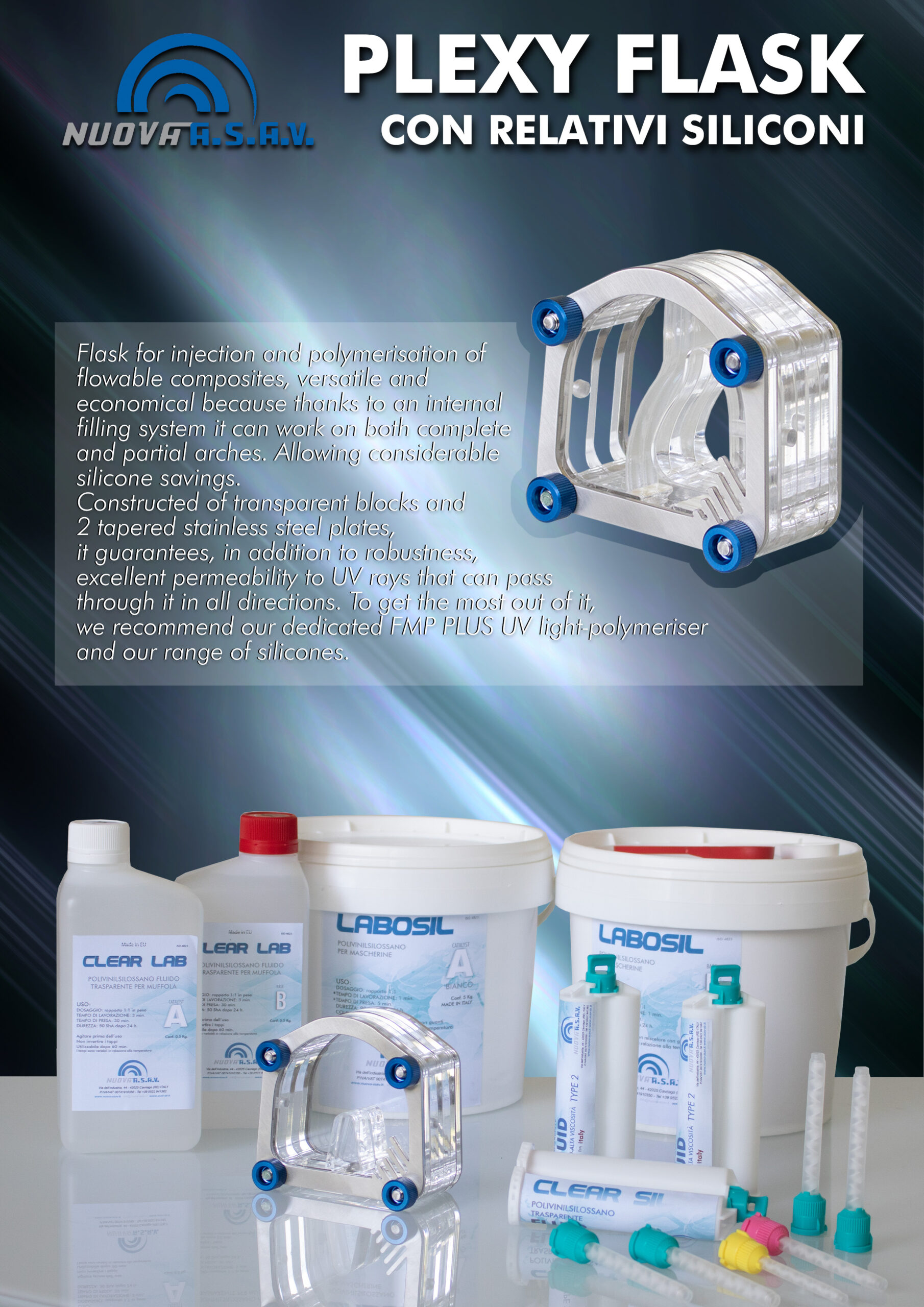 Flask for injection and polymerisation of flowable composites, versatile and economical because thanks to an internal filling system it can work on both complete and partial arches. Allowing considerable silicone savings. Constructed of transparent blocks and 2 tapered stainless steel plates, it guarantees, in addition to robustness, excellent permeability to UV rays that can pass through it in all directions. To get the most out of it, we recommend our dedicated FMP PLUS UV light-polymeriser and our range of silicones.