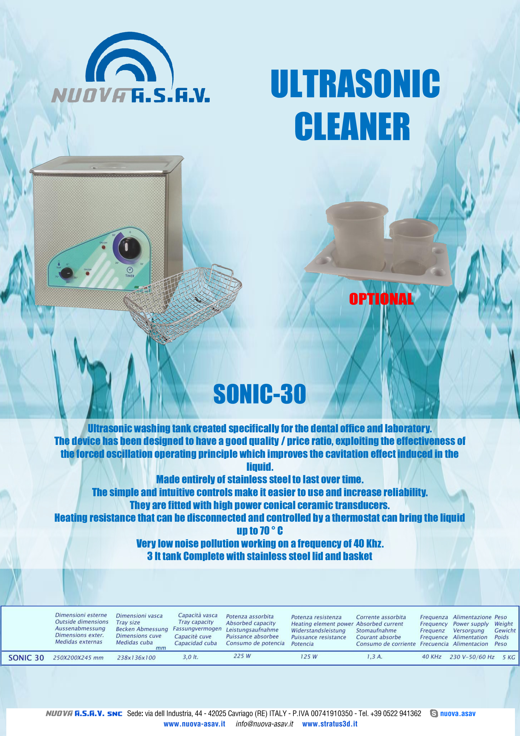 Ultrasonic washing tank created specifically for the dental office and laboratory. The device has been designed to have a good quality / price ratio, exploiting the effectiveness of the forced oscillation operating principle which improves the cavitation effect induced in the liquid. Made entirely of stainless steel to last over time. The simple and intuitive controls make it easier to use and increase reliability. They are fitted with high power conical ceramic transducers. Heating resistance that can be disconnected and controlled by a thermostat can bring the liquid up to 80 ° C. Very low noise pollution working on a frequency of 40 Khz. 4 lt tank Complete with stainless steel cover and basket