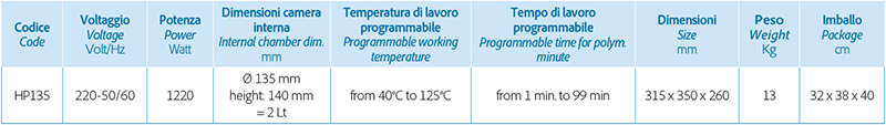 Un microprocessore di alta precisione controlla sia le temperature che i tempi della polimerizzazione Dotata di una camera in acciaio inox lavora con cicli completamente automatici.