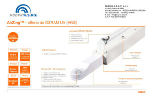 Lampada progettata da Osram per la purificazione dell’aria e delle superfici, monta una lampada UVC da 36 W. ed un sensore di sicurezza a raggi infrarossi per il rilevamento di presenze ed ha un ritardo all’accensione di 30 sec. per permettere agli operatori di lasciare l’ambiente da trattare.